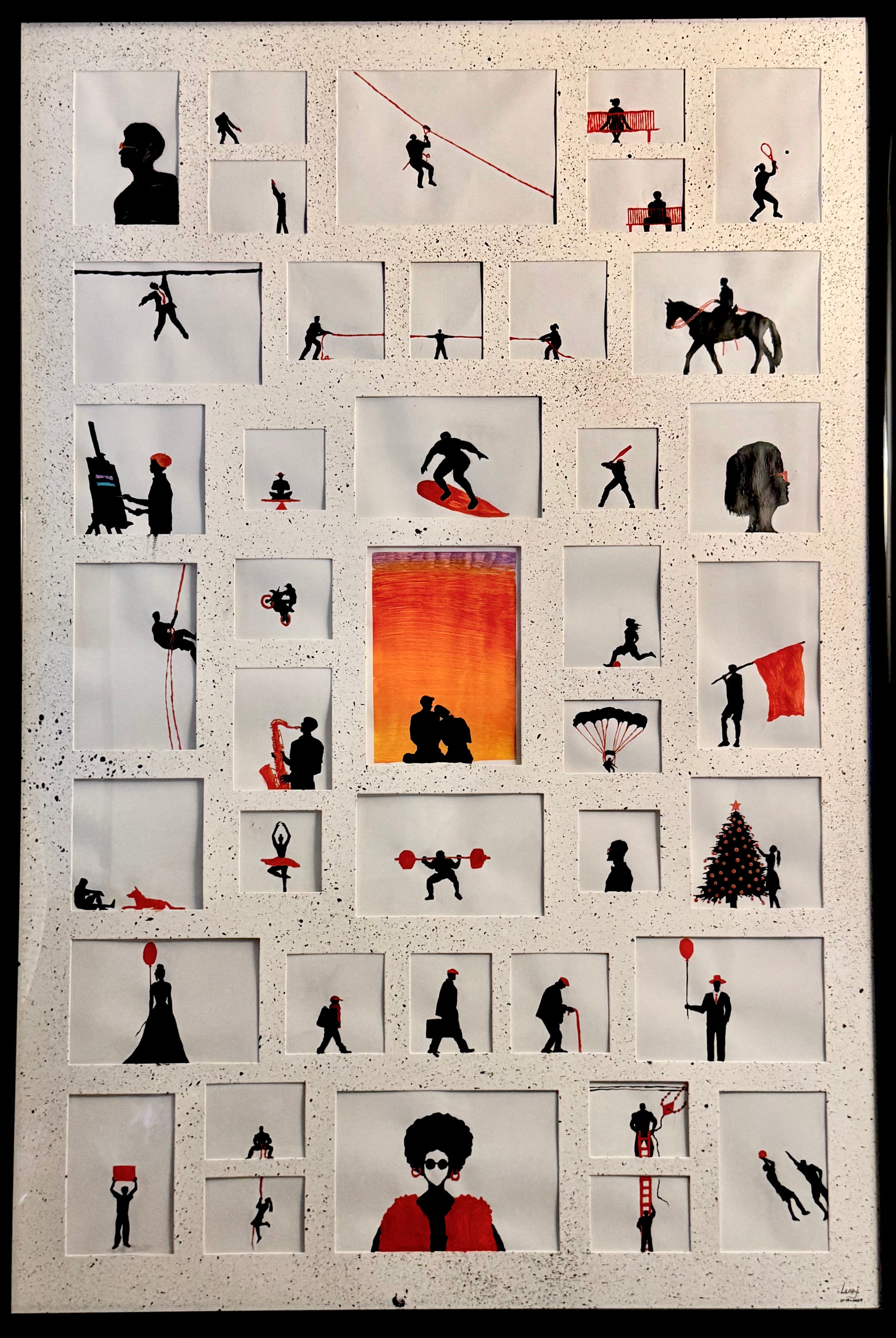 This art piece, by Adeleye Leonard (Lenny), called The Prism of Self is an exploration of identity through fragmented perspectives. The artwork is structured in multiple frames, each representing a different moment, character, or facet of an individual’s inner world. Painted with acrylic paint on a framed matte board 3'5 x 27" (104.4 x 68.58 cm). Every piece of artwork is specifically packaged sealed with fixatives to protect and keep it in perfect condition upon arrival.